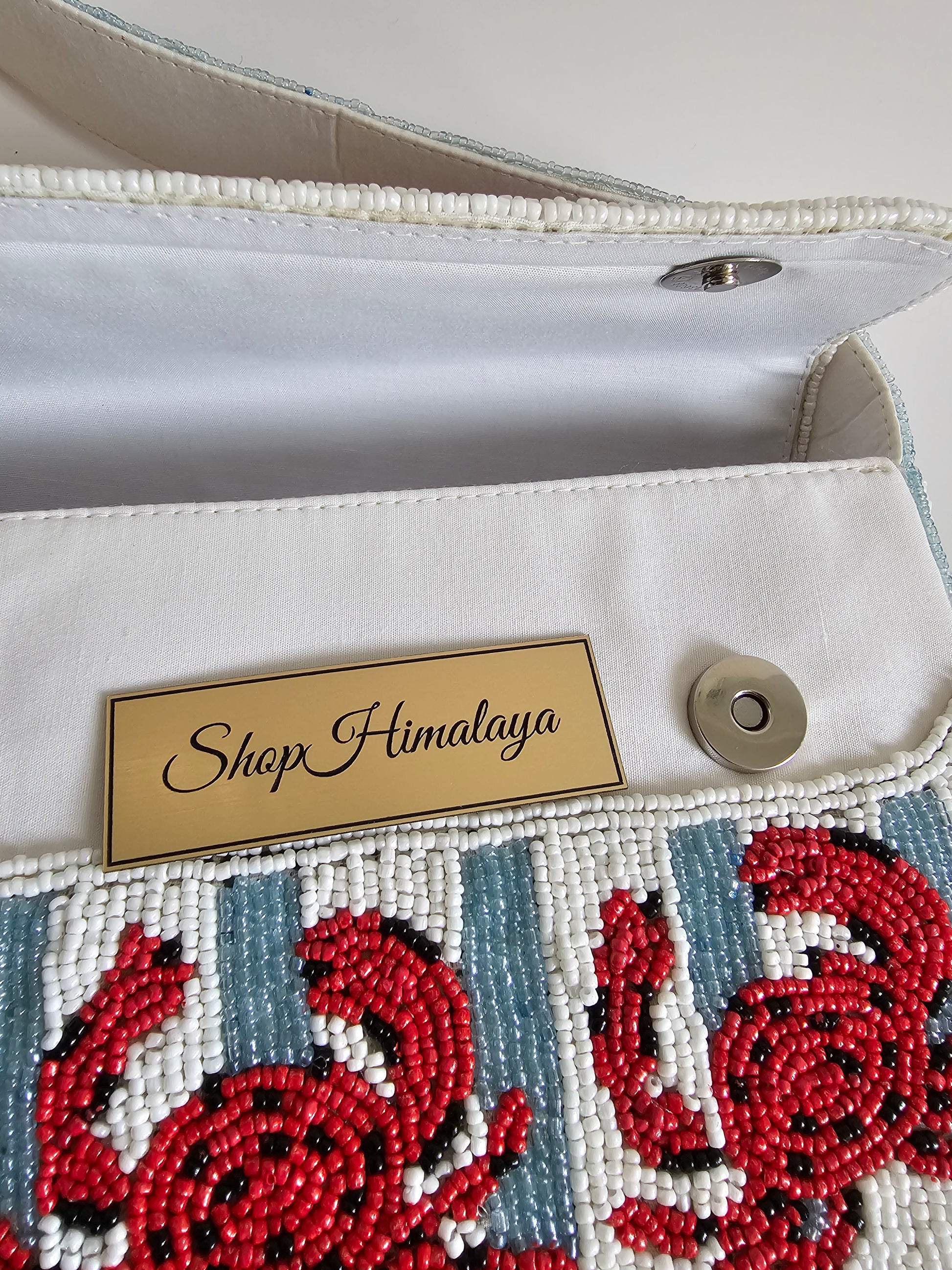 Dive into coastal chic with this unique hand-beaded shoulder bag from Shop Himalaya. Featuring a playful, nautical theme, this purse is adorned with meticulously crafted red crabs set against a striking background of blue and white vertical stripes.
